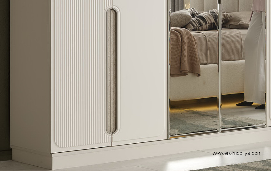 Ürüne Ait Parça Adetleri : 6 Kapılı Dolap, Şifonyer + Aynası, 2 Adet Komodin, Başlık , Çamaşırlık Bu Üründe Başlığa Uygun Baza ve Yatak Ölçüsü : 150 cm * 200 cm veya 160 cm * 200 cm dir(Yaylı Yatak ve Baza Fiyata Dahil Değildir) * TSE |