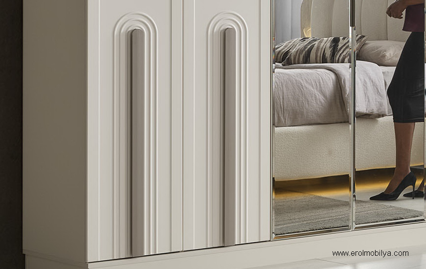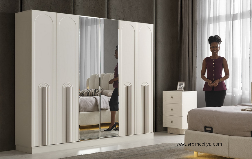 Ürüne Ait Parça Adetleri : 6 Kapılı Dolap, Şifonyer + Aynası, 2 Adet Komodin, Başlık , Çamaşırlık Bu Üründe Başlığa Uygun Baza ve Yatak Ölçüsü : 150 cm * 200 cm veya 160 cm * 200 cm dir(Yaylı Yatak ve Baza Fiyata Dahil Değildir) * TSE |
